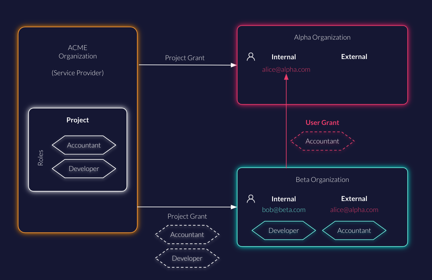 ZITADEL allows you to create separate organizations for each of your business partner or tenant. There might be cases were users from one organization need access to projects from another organization. You can create an external user grant, that allows the inviting organization to manage the roles for the external user.