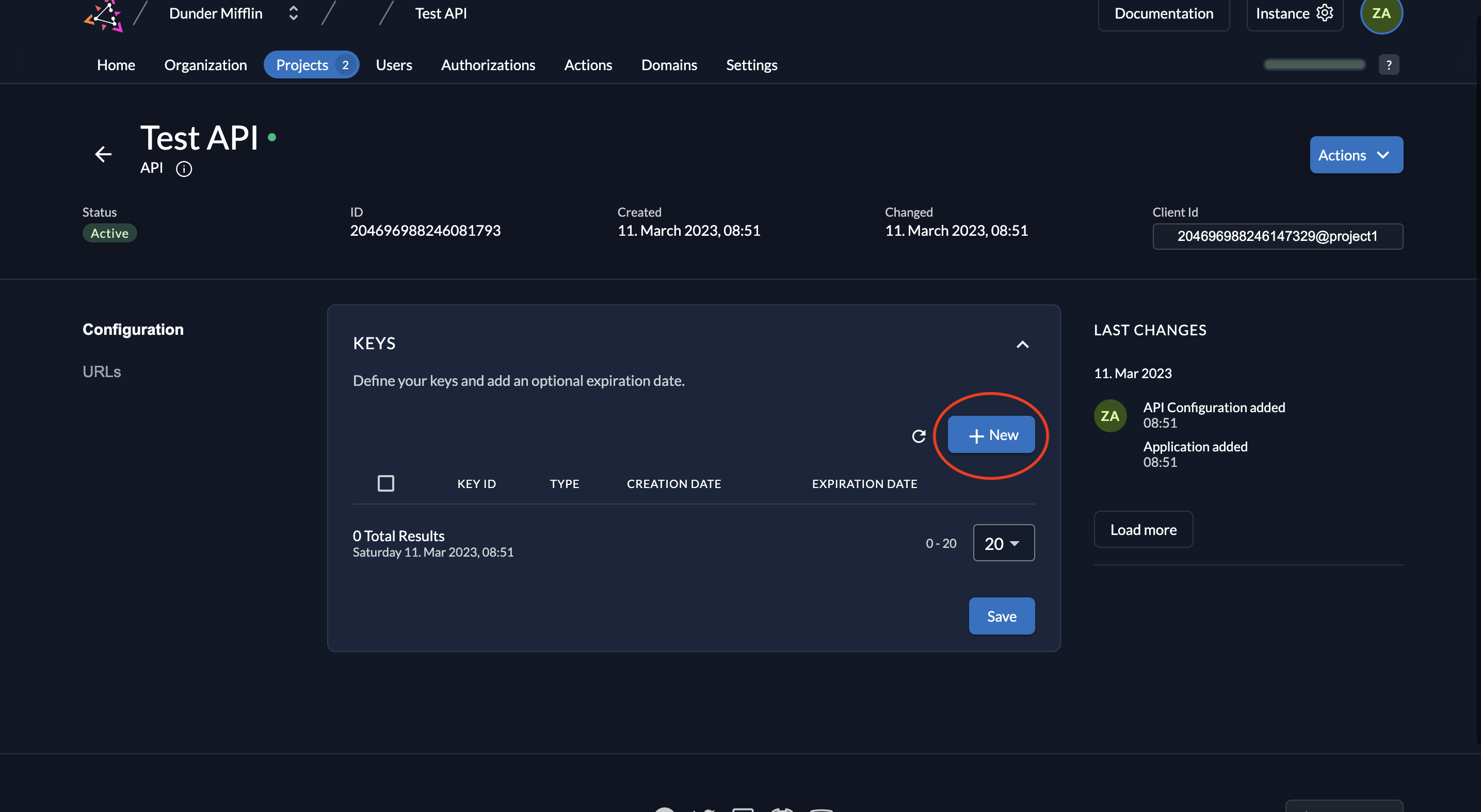 1. To generate a key pair, click New under the application’s keys section.