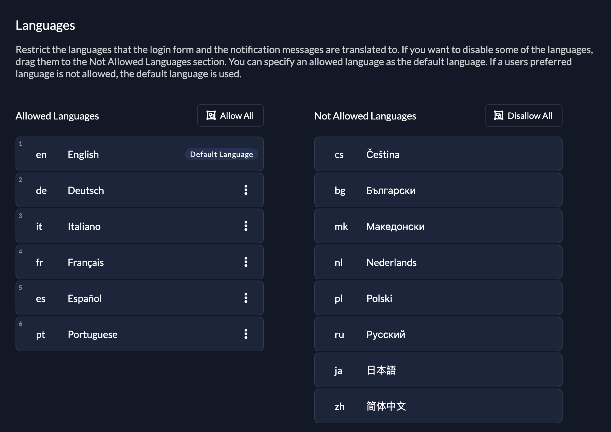 Drag allowed languages to the left column. Languages in the right column are not shown to your users.