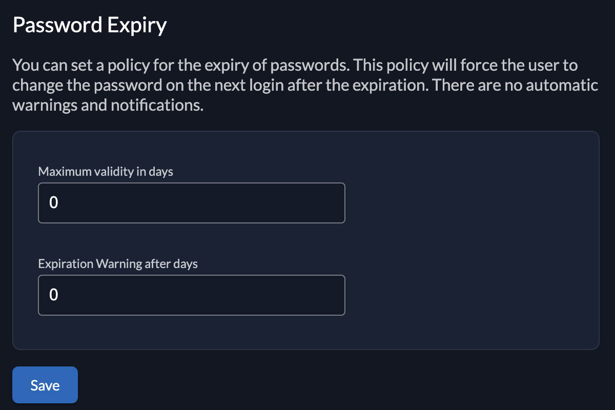 - Password Expiry: Set an expiry for passwords. After the expiration, a user will be prompted to change their password during the next login.