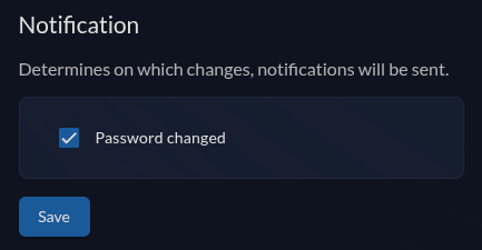 | Password Changed | Notify the user, that the password has been changed. Can be configured in Notification |