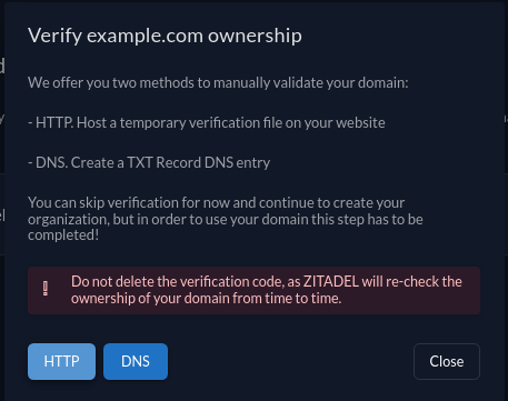 Do not delete the DNS verification record after success. ZITADEL re-checks domain ownership periodically.